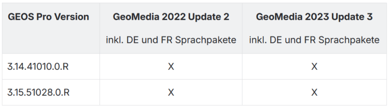 In der folgenden Tabelle finden Sie Informationen über die Kompatibilität zwischen GeoMedia und GEOS Pro.