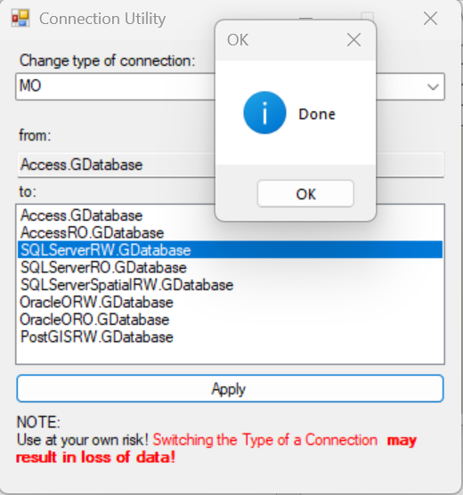 Zum Verwenden die gewünschte GWS öffnen, dann die Verbindungen aufrufen und das Tool starten. Im folgenden Beispiel soll eine Access-Verbindung durch eine SQL-Server-Verbindung ersetzt werden. So sieht das Tool aus: